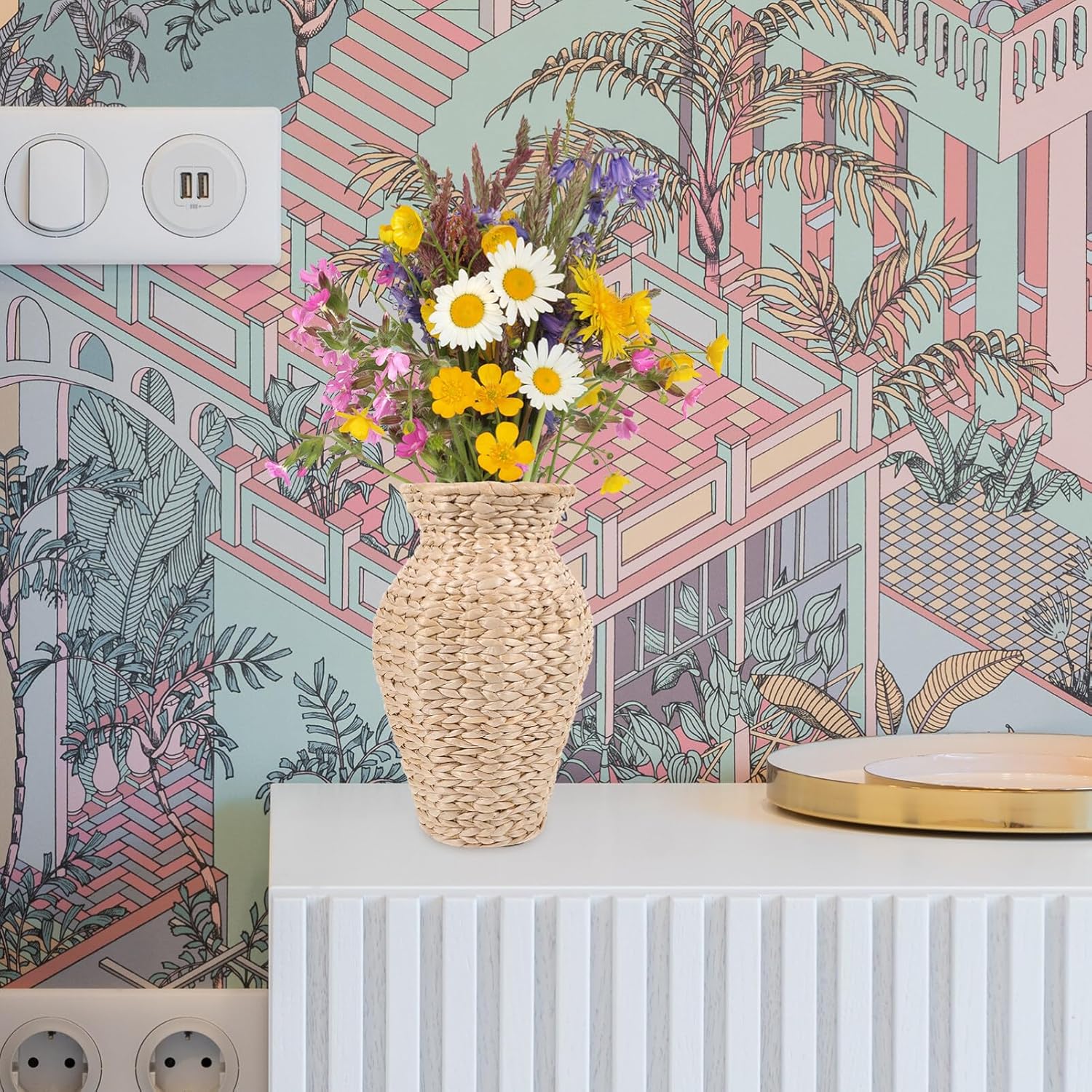 Alipis Rattan Vase, Country Style Woven Plant Holder Basket Rustic Flower Vase Hand Woven Dried Flower Vase Weaving Basket Flower Arranger for Wedding Home Decor