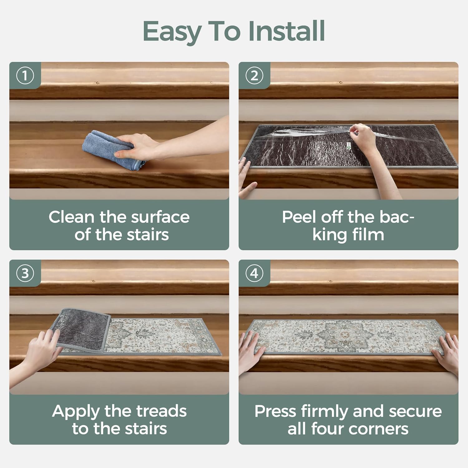 Make sure stairs are clean and dry. Apply from one end, press firmly toward each corner, then place a heavy object for a few minutes. Voilà—no more curling edges!