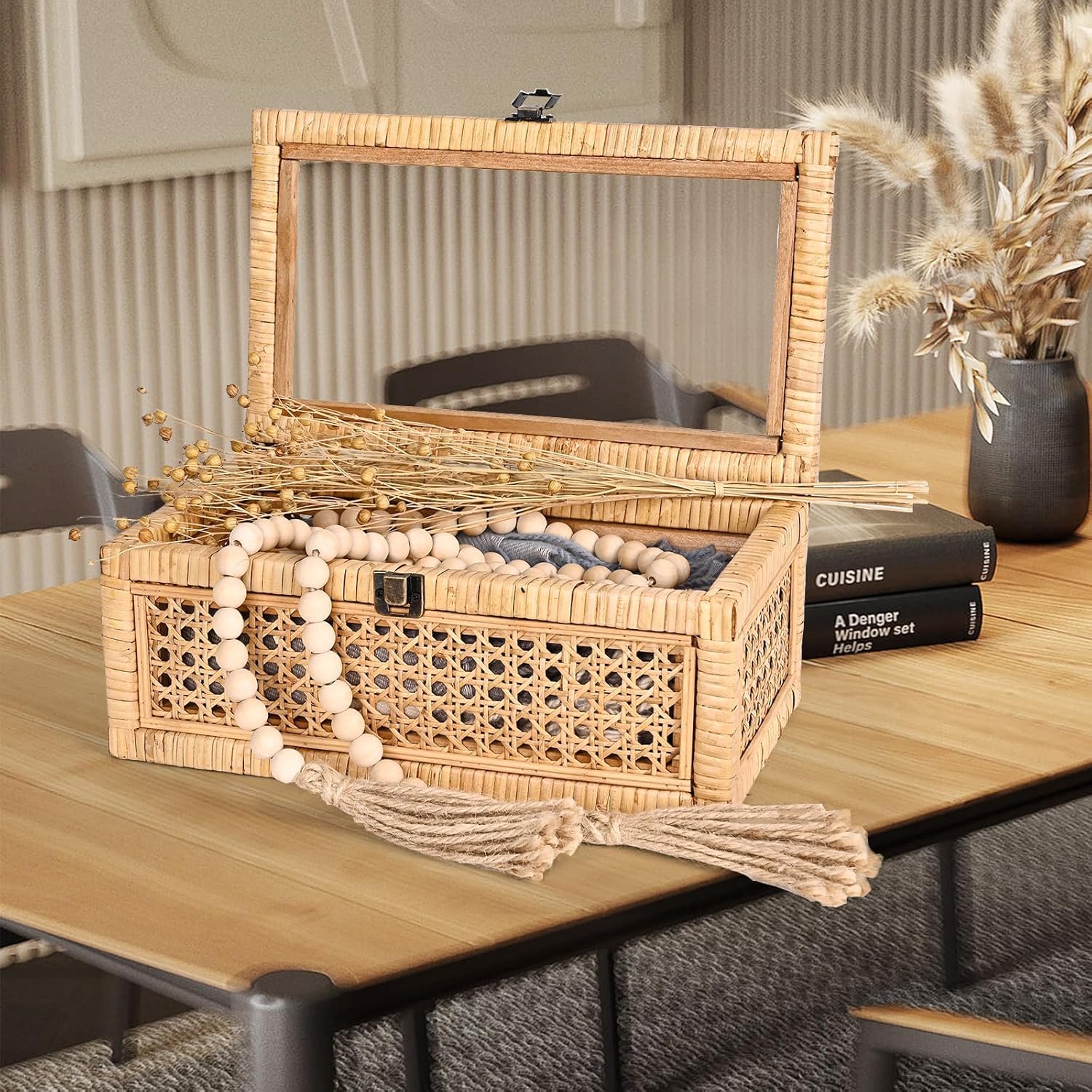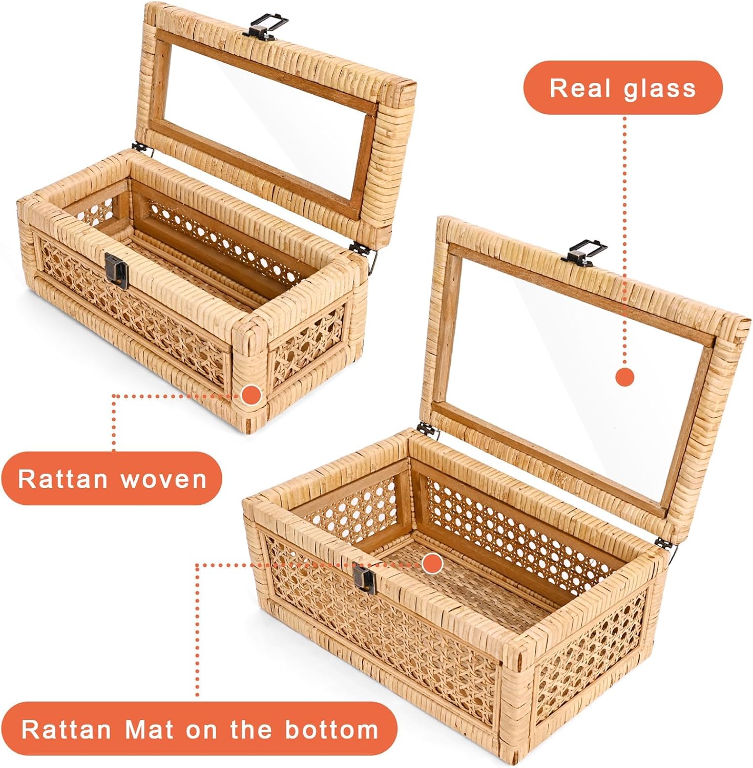 Rattan Decorative Box with Lid, Rectangular Woven with Glass for Display, Set of 2 Wicker for Decor