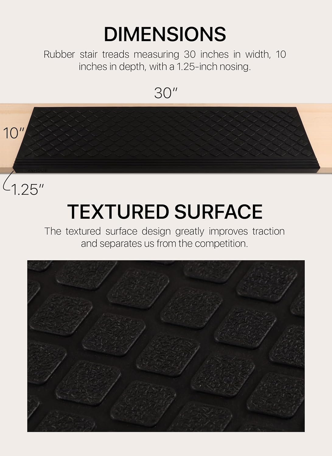 Please measure your stairs to verify sizing (can be cut to fit your needs).SAFETY FIRST: The rubber treads are designed to keep your stairs and surfaces safe all year round. The textured surface design provides additional safety with its improved traction. SAFE FOR PETS & BARE FEET: Our rubber treads are not too rough to damage the paws of your pets or bare feet. The gritty surface provides just enough traction to keep you and your loved ones safe.WATER RESISTANT FOR OUTDOOR USE: Tested in numerous conditions, the rubber treads stand the test of time and weather conditions (snow and rain). LOW MAINTENANCE: Once installed, the rubber treads will not give you any additional maintenance tasks aside from removing snow and ice as you usually would.