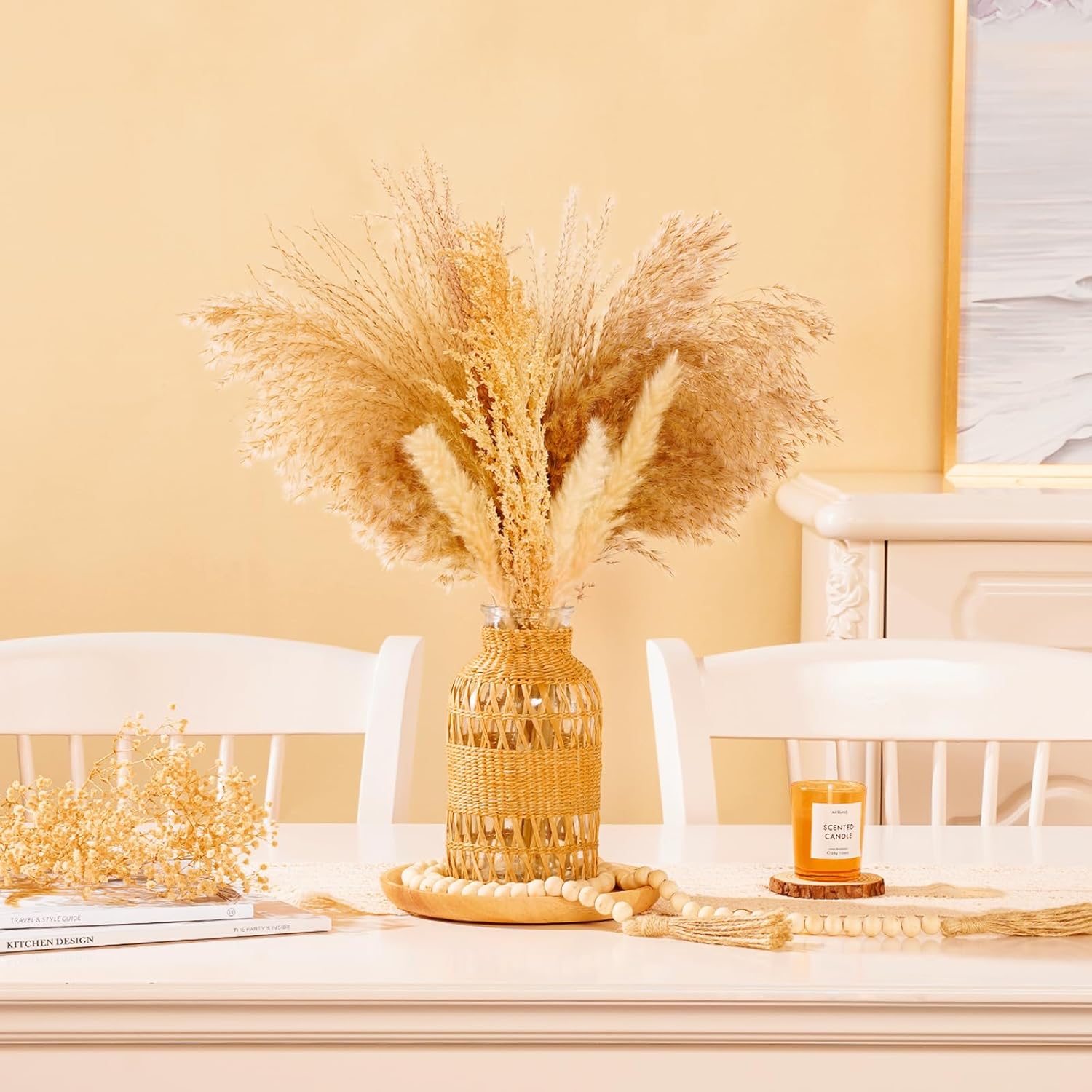 ZENS farmhouse vase cleverly combines straw woven handicraft on the glass vase perfectly.The texture is flat and smooth. National Intangible Culture is expressed perfectly by the Handmade Woven on the Glass. Creating a unique vase artwork, boho rustic style makes your home decor no longer monotonous. When your living room looks empty, Having this stunning vase makes your home and nature instantly close.